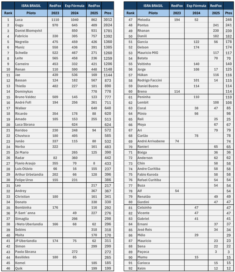 Ranking ISRA Brasil 2026 Publicado em janeiro 21, 2026janeiro 22, 2026 por IB 2023 – Red Fox 2024 – Espaço Fórmula 2025 – Red Fox 2026 – Alpha King (Julho e Setembro)